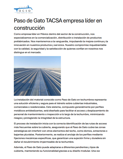 El proceso de instalación inicia con la correcta identificación de las rutas de acceso más frecuentes sobre la cubierta, asegurando que el Paso de Gato cubra las zonas estratégicas sin interferir con otros elementos del techo, como domos, extractores o bajantes pluviales. Posteriormente, se realiza el anclaje de los perfiles mediante fijaciones mecánicas específicas, que garantizan una sujeción firme y duradera sin dañar el recubrimiento impermeable de la techumbre.